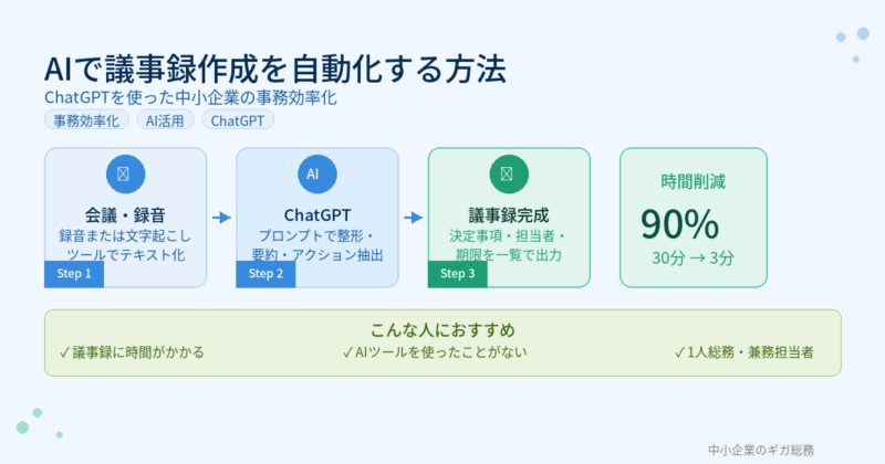 この記事が役に立つ人 会議のたびに議事録作成に30分以上かかっている 1人総務や兼務で、とにかく時間が足りない AIツールを使ってみたいが、何から始めればいいかわからない はじめに:議事録って、地味にしんどい 会議が終わった後、ぼんやりした頭でメ... -